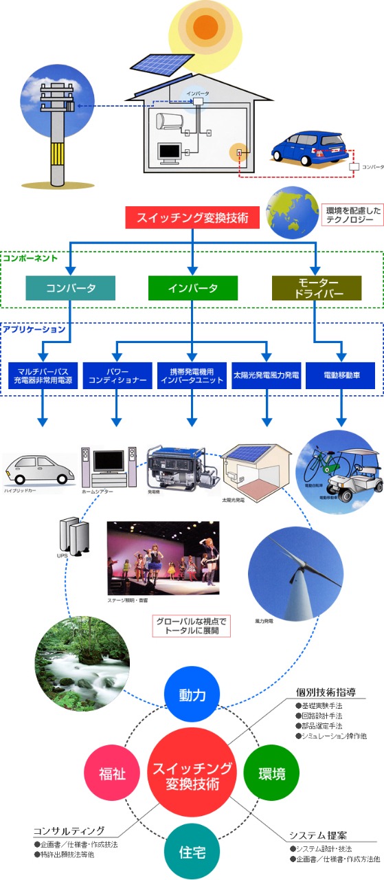 創造的な独自技術、最新エレクトロニクス技術を活用した高効率大電力DC/ACインバータ、低電圧大電流コンバータモジュール等の開発および製品化を通じて、皆様の要求を満たし、また、新規事業のご提案をさせていただきます。